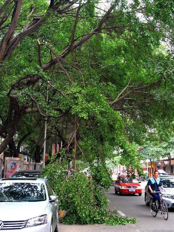 ?4月15日中午,在梧州市西江三路公交“大廈”站附近,路邊一棵榕樹的臨街一側(cè)枝干,從約三層樓高處折斷,枝葉垂下道路,和樹下停放的小轎車發(fā)生接觸。事故發(fā)生后,市政工作人員趕到現(xiàn)場,將折斷的枝干切斷后再進(jìn)行清除。 西江都市報(bào)記者 何鎏/攝