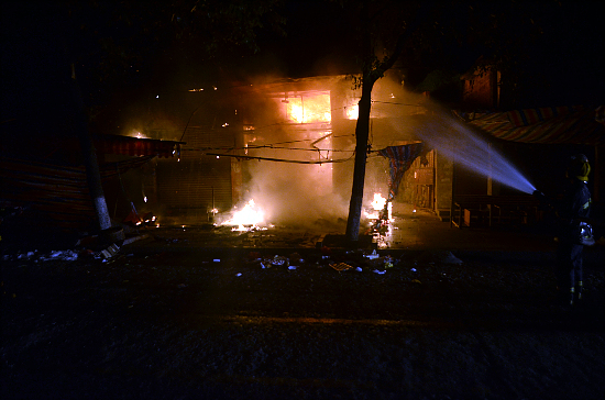 ????凌晨5時13分,消防官兵到達火災現場發現,起火位置為一家經營水果銷售的攤鋪,此時,攤鋪周圍一片通紅,火勢正處于猛烈燃燒階段,火光沖天并伴隨著滾滾濃煙,火勢威脅著樓上的居民和鄰近的商鋪,情況危急,如不及時控制火勢發展,后果堪憂。
