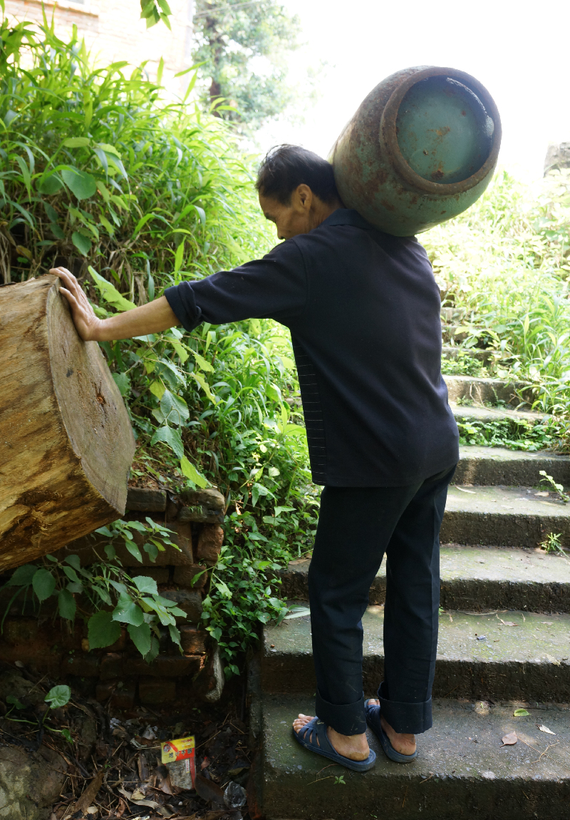 隨著年紀的增長,以往一口氣就可以把燃氣罐背到山頂的袁志榮,如今,中途得停靠下來休息一下,才能繼續前行。