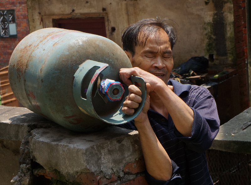 ????在梧州市云蓋山一帶,街坊們常看到一位背液化氣罐的苦力工,穿街過巷,或沿著石階負重登山,把液化氣罐送到訂燃氣的街坊家里。有時候,他也幫街坊們運送蜂窩煤。