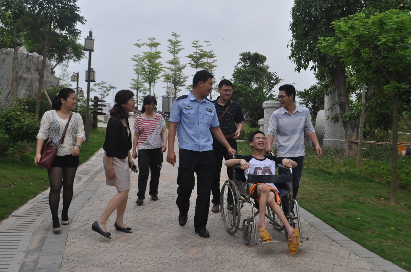 ????這時,豐業社區民警朱俊源抱著體重50多公斤的22歲小伙子梁琪,走向正在等候的人們。當天,大家要幫助他實現游覽玫瑰湖公園的心愿,因為梁琪出生后3個月,就被診斷為腦萎縮,雙腿因此而殘疾。