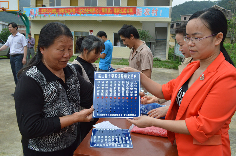 據了解,該縣開展星級文明戶十星“五評”活動以來,在全縣9個鄉鎮12個村屯647戶開展試點工作,對評出的十星文明戶頒發牌匾,樹立“美麗蒙山·清潔鄉村”文明戶典型,進而帶動更多的群眾爭創文明戶。 戴連升 攝