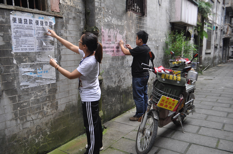 騎著便民服務車巡邏過程中,社區工作人員發現小廣告后即時清理。記者 萬立平/攝