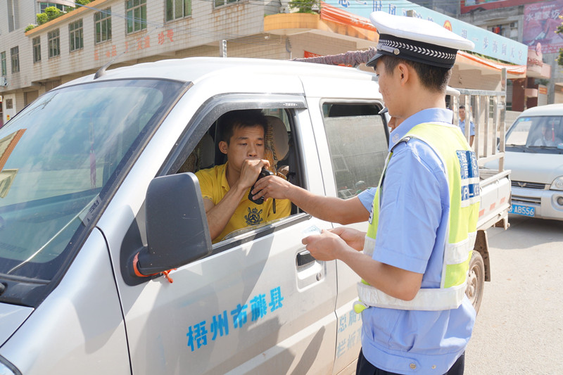 ??? 5月3日,在藤縣縣城,交警對車輛駕駛員進行酒精測試。