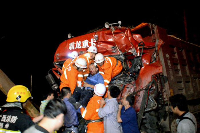 當晚22時許,梧州市119指揮中心接到報警后,迅速聯合岑溪市110指揮中心調集消防、交警、120急救等部門處置。隨后,救援人員到達現場發現一輛泥頭車,其車頭與路旁一棵桉樹撞擊后停在路邊,一對夫妻被困駕駛室內,男子已接近昏迷,旁邊一輛受撞擊后嚴重變形的小貨車,其運載的三黃雞散落一地,一名中年婦女頭部受傷。
