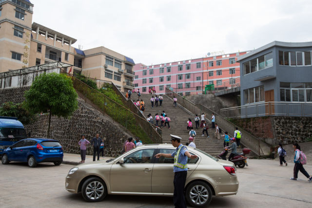 ????5月4日,在新興二路小學校門前,交警指揮接送學生的家長規(guī)范車輛停放。