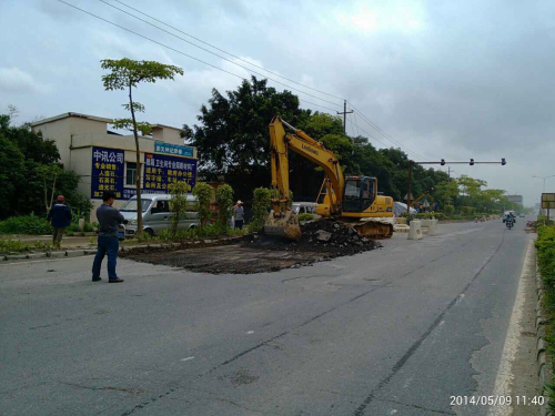 ????5月9日,在西江大橋至盤龍坳隧道道路沿線整治工程現場,施工人員利用機械開挖路面。謝韻 譚旭輝/攝