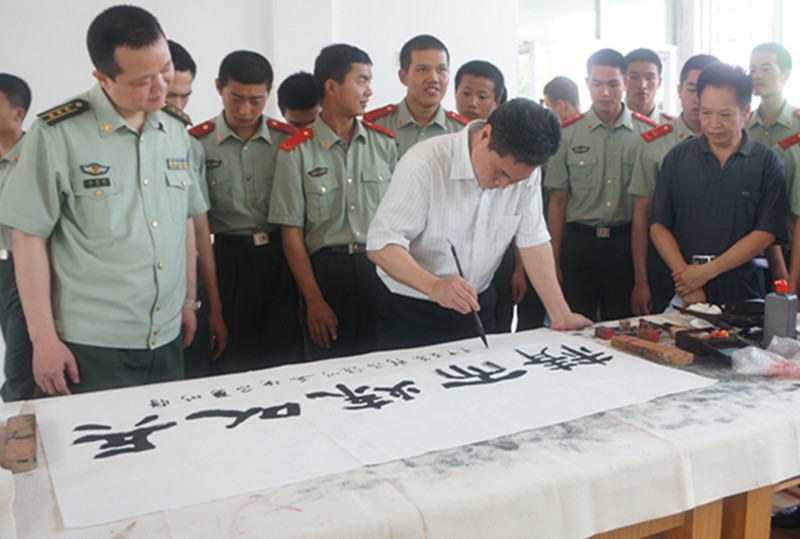 書法家們現場揮毫向部隊官兵贈送書法作品。