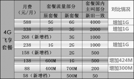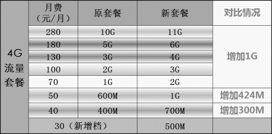 ????廣西移動工作人員介紹,4G流量套餐優化后,門檻由有原來的40元/月降至30元/月,資費由原有的7檔升至8檔,各檔套餐套內流量均較原套餐有大幅增加,70元以上套餐套內流量增加1G,折合下來,套餐內流量單價最高下降了50%。而4G飛享套餐優化后,門檻由88元/月降至58元/月,資費由原有5檔升至8檔,增加58元檔,158元檔,268元檔,各檔次均較原資費同一檔次套餐增加了300M-1G的套內流量。