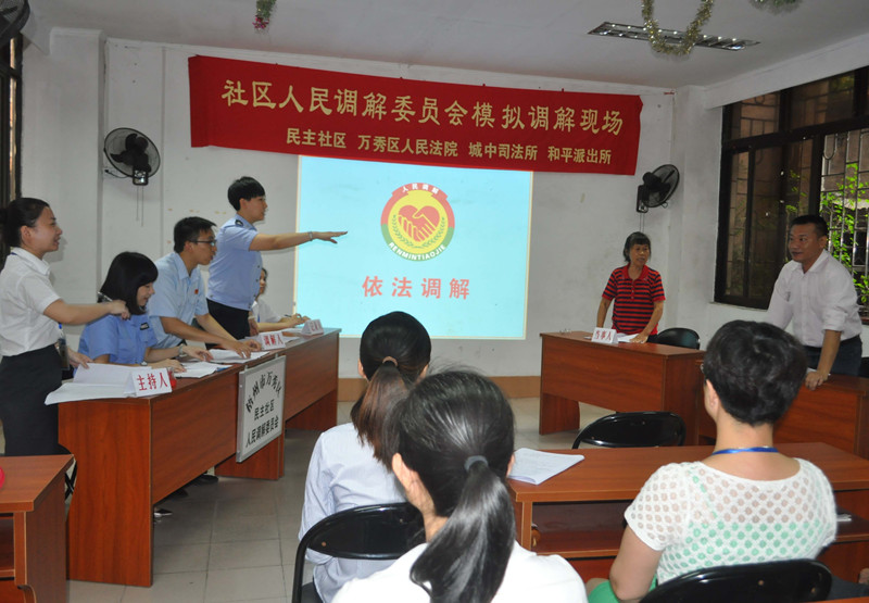 ????5月15日,梧州市萬秀區民主社區居委會、萬秀區人民法院、萬秀區城中司法所、和平派出所等單位,舉行了社區人民調解委員會模擬調解現場活動,給居民上了一堂生動的調解課。
