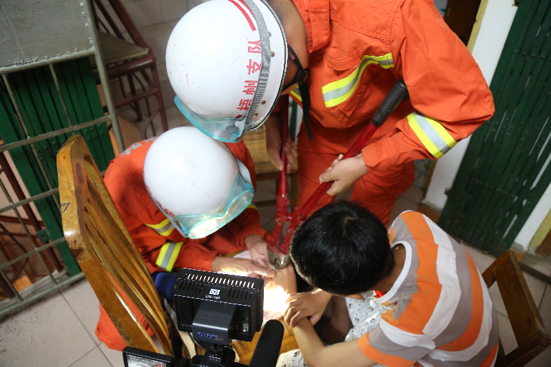 消防人員用專業(yè)工具取下男孩手上鋼環(huán)。 雷開偉 黃勇/攝
