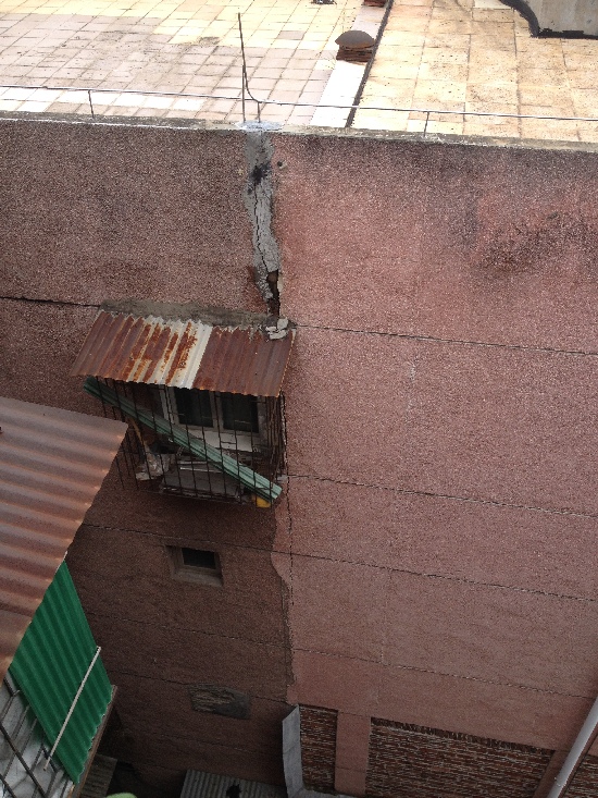 鐘先生家所在樓房的裂痕從六樓天臺一直延伸至三樓。
