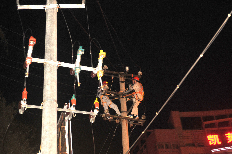 21日晚上,電力人員在搶修受損線路。 本報記者 蒙紹松/攝