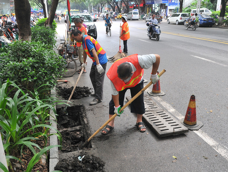 ?近段時(shí)間我市降雨頻繁,市政管理部門組織力量,對(duì)文瀾路、新興二路、大學(xué)路等內(nèi)澇易發(fā)地點(diǎn)的排水渠進(jìn)行清淤,確保排水順暢。 李鴻榮 攝