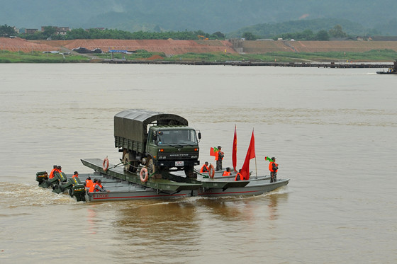 5月28日,在梧州老碼頭公園對開的西江江面上,梧州陸軍預備役工兵團官兵進行抗洪搶險水上演練。演練中,官兵用四舟輕型門橋成功運輸車輛。 記者 何鎏/攝