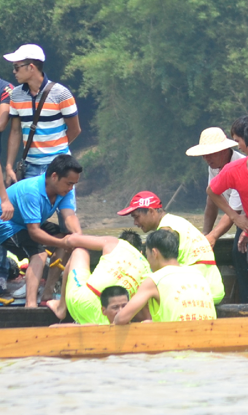 幸好,龍舟健兒們落水不到半分鐘,數(shù)條機動船已疾馳至龍舟邊,機動船上觀戰(zhàn)的群眾七手八腳地將參賽隊員拖上船只,江面上隨即傳來陣陣笑聲。
