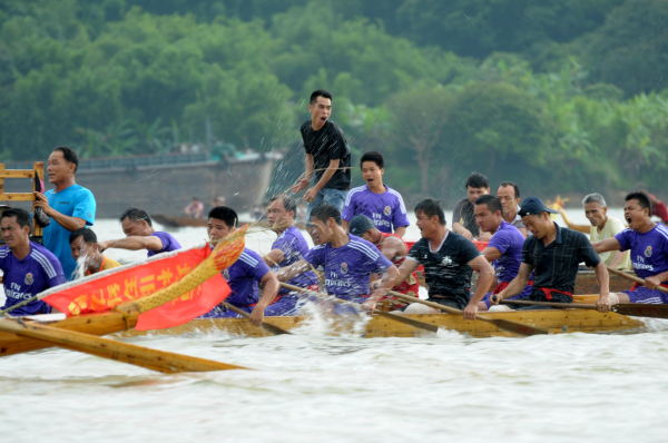 早已下水備戰的還有奪冠熱門隊伍蒼梧人和隊,在過去四年的龍舟賽中,人和隊勇奪一次冠軍三次亞軍。好成績不僅得益于充足的訓練與默契的配合,與當地濃厚的龍舟氛圍以及熱情更是分不開。“記憶中,我會走路時就跟著大人去看龍舟賽了。”該隊領隊黎東強笑言。他在當地經營了一家養魚合作社,為了組織隊員參賽,他推掉了不少外地客商的訂貨要求,為的就是充分備戰。黎東強介紹,人和每年每到農歷五月初一,就會自發組織一場龍舟熱身賽,邀請附近縣市的龍舟隊參加,宣傳和發揚人和的團結拼搏、力爭上游精神的同時,也為慶祝端午紀念古人,將龍的精神文化傳揚下去,并鼓勵人們要激流勇進、拼搏奮發,這天人和同鄉會還會派發龍舟飯、燒豬、粽子,與村民們共度端午節。