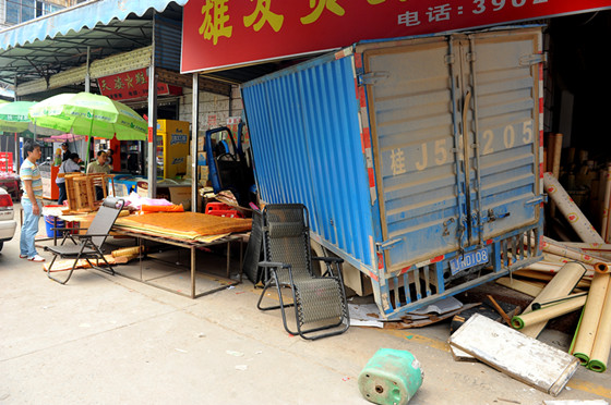 ????據摩托車司機劉桂源說,當時他正在道路上正常行駛,因該路段受損嚴重,大部分車輛的車速都很慢。但這輛貨車的速度很不正常,直向前沖,已經不受控制,幸好他及時側翻摩托車閃避,自己才未被卷入貨車底,但摩托車則被貨車繼續拖行向前。隨后,位于兩廣市場B區商鋪前方的其他摩托車司機及路人見勢不妙,及時避開貨車。貨車撞到B區8號商鋪內的商品和貨架后,還繼續向前沖撞,直至撞上水泥臺階,才被商鋪里的一堵墻擋住,最終停下。