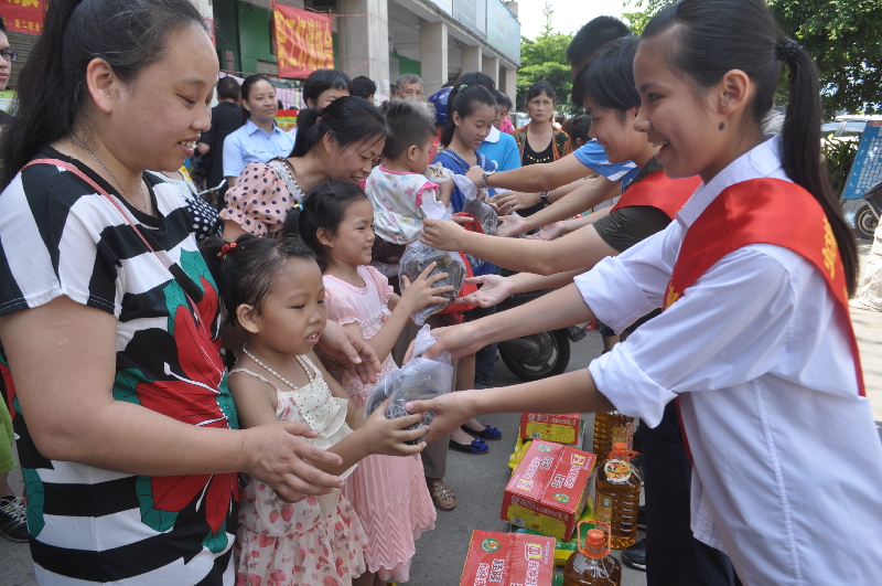 ????梧州學(xué)院的志愿者以及社區(qū)黨員義工,將包好的粽子送給留守兒童。西江都市報(bào)記者 萬立平/攝