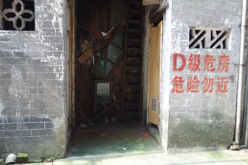 ????維新里西一巷7號的大門,已用木板、玻璃窗等東西封了起來,墻壁上印著“D級危房,危險勿近”的紅色字樣。
