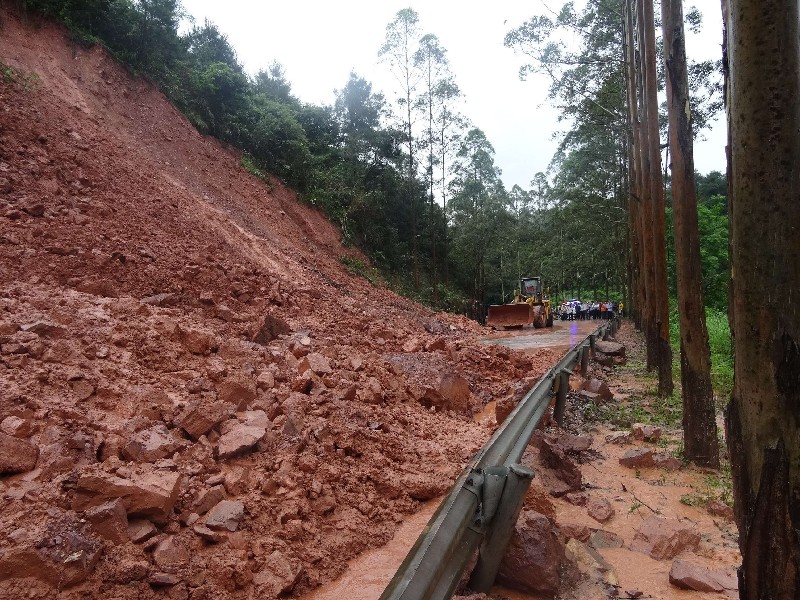 ????受強(qiáng)降雨天氣影響,當(dāng)天13時05分,該路段上邊坡發(fā)生塌方導(dǎo)致交通中斷。災(zāi)情發(fā)生后,蒙山縣及桂東公路管理局及時組織排險搶通,于15時30分恢復(fù)半幅通車。聶建華 攝