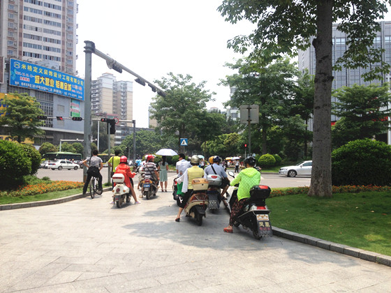 ????6月13日中午12時許,記者來到梧州夢之島時代廣場對出的十字路口處采訪。時值中午,陽光強烈,許多來往的行人都打起了太陽傘。記者發現,在該十字路口附近種植的綠化植物大多是一米多高的樹叢,“吸引”了許多騎自行車、助力車和摩托車的市民停靠。他們通常選擇從機動車道轉入人行道等候,待綠燈亮起時再冒險插入前行的車流中。“沒辦法,等待紅綠燈的時間如果長了,人就被曬得受不了。”一位摩托車司機坦言。