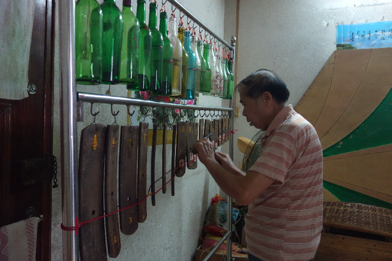 ????“聽,這是‘哆’,這是‘咪’……”岑寺云從低音到高音逐個敲擊酒瓶并解釋道。如今,每個瓶子里裝多少水,按照怎樣的順序擺放,對于演奏了近50年的岑寺云而言,再熟悉不過了??稍谧畛醯臅r候,他是從廢品站里逐個淘回酒瓶,反復進行試驗?!巴环N酒瓶音色也不一樣?!贬略普f,他遇到的失敗經驗可不少。有一次他花20元買回了一瓶新的紅酒,但是酒瓶的音色就是差了些許。他指著墻角邊的一個塑料袋說:“這里面還裝著幾十個酒瓶,都是備用的。”