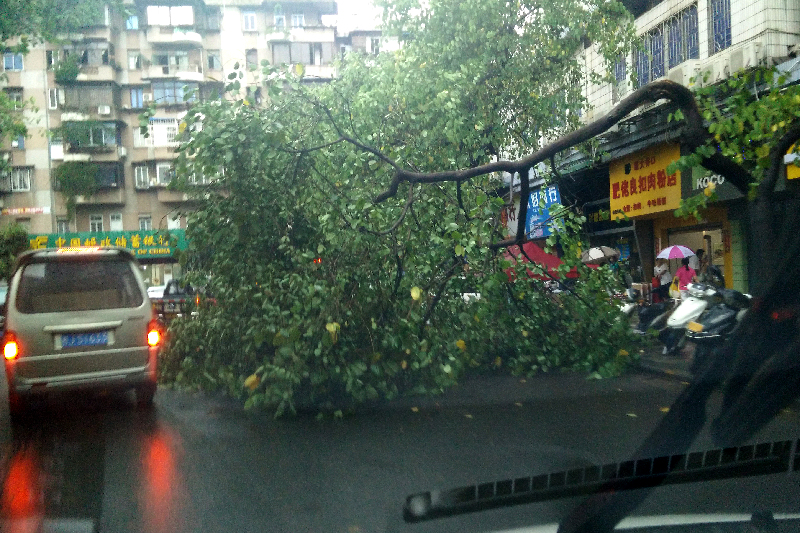 ????6月19日,倒塌的樹木遮蓋了道路的大半面積,僅剩一輛汽車通過的位置。