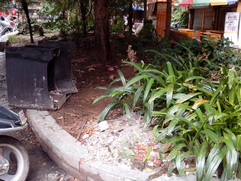 新興小區(qū)小游園舞臺(tái)旁的一處綠化帶,成了不少市民的“方便”之地。