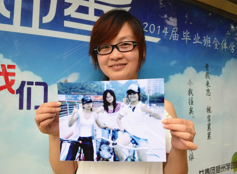 ????電腦里,一張拍攝于2011年夏季的照片引人注目。照片上,她和兩名女同學(xué)在桂江一橋騎單車,女孩們豎起大拇指,青春靚麗,笑靨如花。胡寶艷說:“這是美好的時(shí)光,可惜再也回不去了,我舍不得離開梧州。”