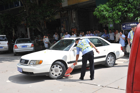 ????當日上午10時,在龍興路口,一輛車牌號為粵J的奧迪白色小轎車引起了交警的注意。當時,在沒有交警人員上前要求檢查的情況下,這輛小轎車突然倒車試圖離開,并撞倒了三個錐形筒,其略顯慌張的動作,令交警人員起疑。隨后,交警人員上前要求駕駛員出示行駛證和駕駛證。在檢查中,交警人員發(fā)現(xiàn),該車在交通內(nèi)網(wǎng)上沒有記錄,這表明這輛車很可能為套牌車。