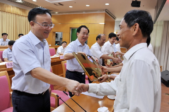????6月30日,市委書記黃俊華,市長朱學慶在梧州市慶祝中國共產黨成立93周年大會上,為第二批市級基層黨建工作示范點單位代表授牌。 孟亞西 攝