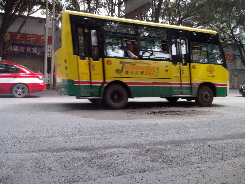 公共汽車經過破爛路段時,通常會繞到對向車道行駛。 見習記者 吳艷虹/攝