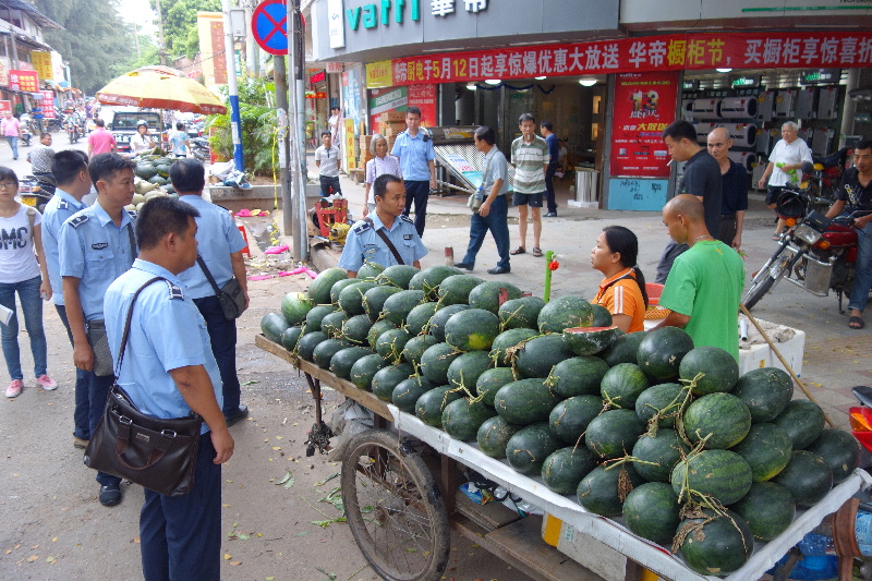 7月1日,梧州市長洲區(qū)城監(jiān)大隊(duì)的執(zhí)法人員在恒祥二期小區(qū)的路口勸離占道經(jīng)營的攤販。 本報記者 龍?zhí)靷?攝