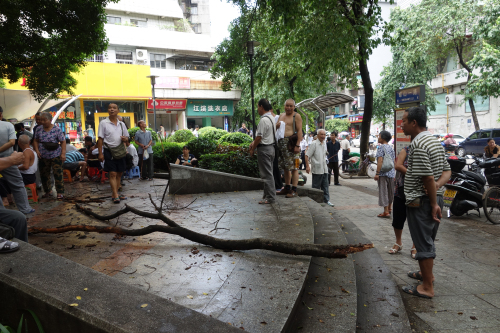 ??? 近日上午,在怡景大酒店對出的小游園,一棵高大的榕樹上突然掉落一根長約6米、足有碗口粗的斷枝。掉落的斷枝不僅絆斷了一條電線,還刮到了一名正在小游園內(nèi)打牌的市民,幸運(yùn)的是這名市民并無大礙。近段時間以來梧州市雨水頻繁,園林綠化部門應(yīng)該加強(qiáng)對路樹養(yǎng)護(hù)工作,及時排查病樹隱患,以防路樹傷人的意外事件發(fā)生。 西江都市報記者 黃海志 攝影報道