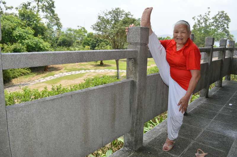 一字腿、壓腳,這對85歲的鄒柏英老人而言毫無難度。 戴連升/攝
