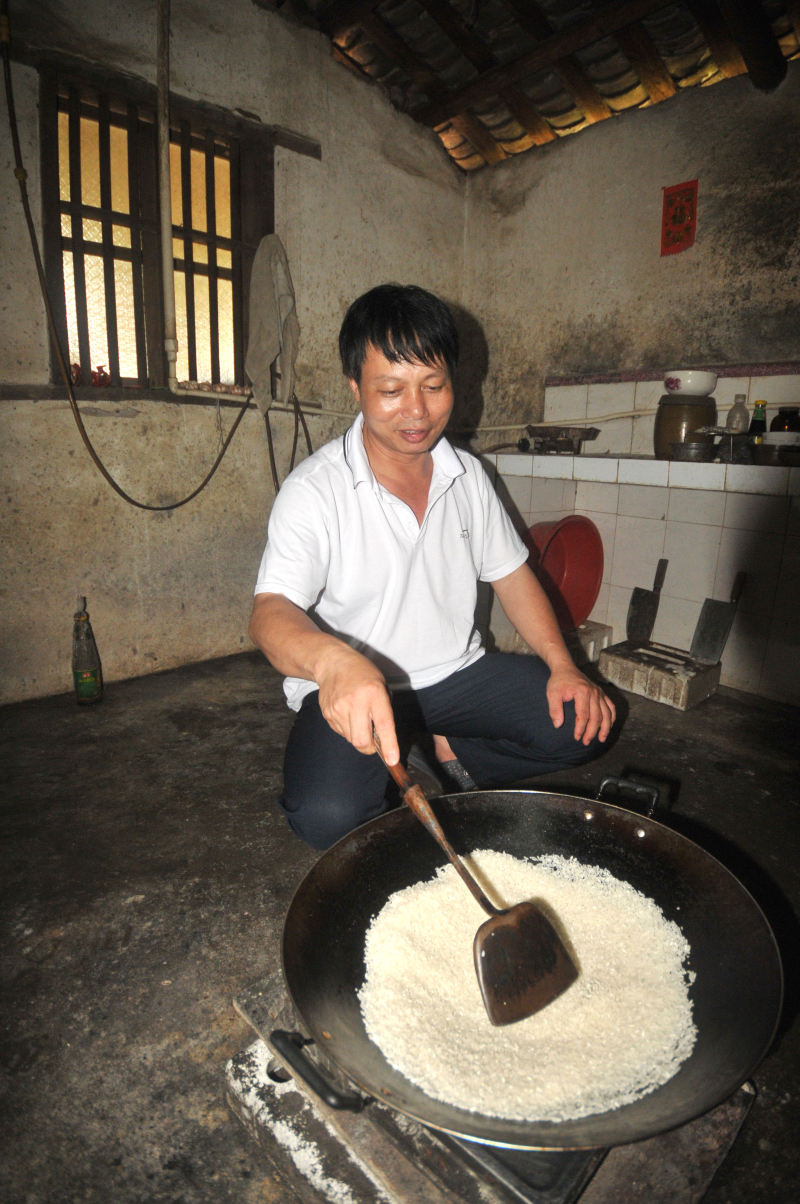 鐘映光在制作炒米。炒米是腌制酸肉的主要輔料。