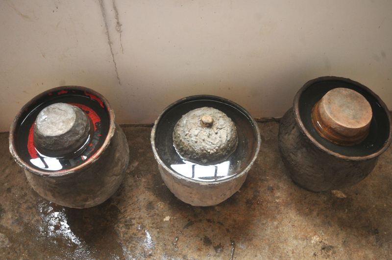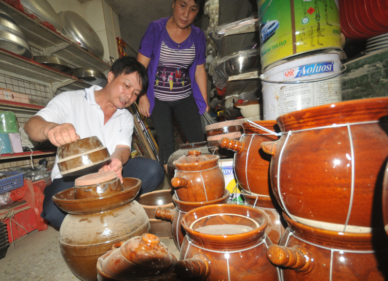 ?倒水鎮(zhèn)上有不少店鋪專門出售腌肉的壇甕,選甕的關(guān)鍵是看它的密封性。