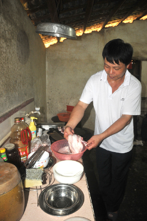 ????村民的物質(zhì)生活越來越豐富,這門技藝也無可避免日漸式微,但是,時(shí)至今日,它依然有著自己的生存空間。鎮(zhèn)上做著腌制酸肉的絕大部分是生豬屠宰戶,家住倒水鎮(zhèn)倒水村鐘屋組的鐘映光就是其中一戶,“夏天天氣炎熱,豬肉難賣動(dòng),做成酸肉便是一道開胃的菜肴。僅六月份,我們家就做了三回,每壇大概腌制十多公斤重的豬肉?!?/p>