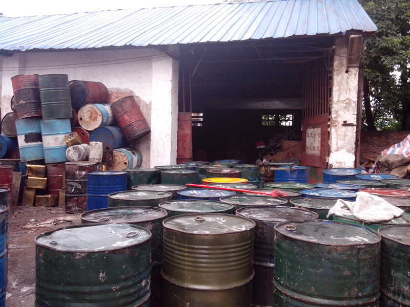 記者采訪時看到,該豬油作坊外堆滿放置豬油的鐵桶。吳艷虹 攝