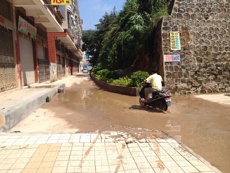 ??? 《西江都市報》5月16日6版曾經報道,梧州市市政部門撥專項資金硬化金湖北路。時隔僅兩個月,這條路靠近新興二路小學方向的路障已經不見,而且路面還有大量積水。7月7日,筆者經過這條道路時,發現該處積水嚴重。小七/攝