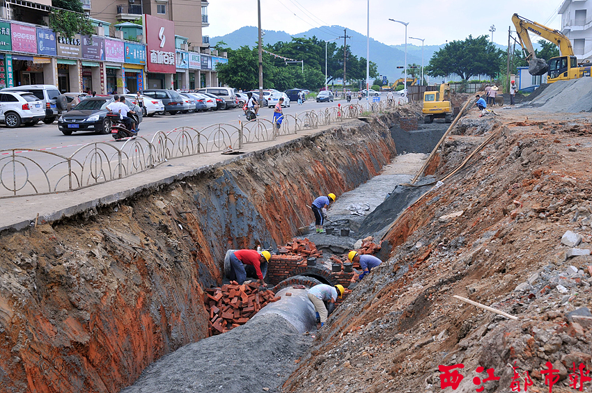 7月12日,施工人員在日化路進行排水管道填埋。由于西江四橋建設,日化路部分地下管線需進行移改。截至目前,該路段已完成排水管道移改、填埋200多米。李鴻榮/攝