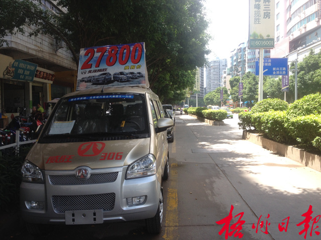 ????7月14日上午,在新興二路交通局對出路段,一輛新車停放在非機動車道的黃線內(nèi)待售。