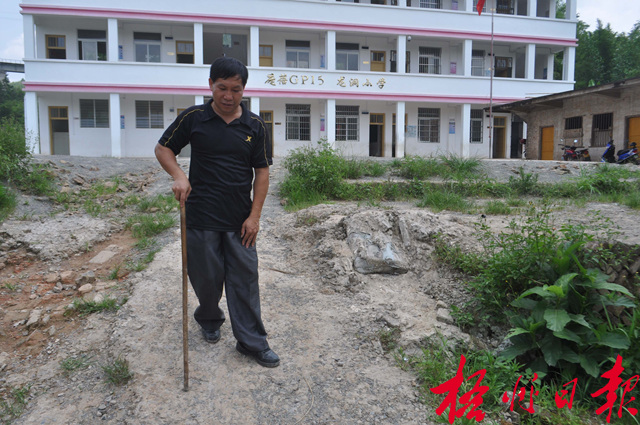 ????下午4點半,“叮鈴鈴……”隨著最后一堂課下課鈴聲響起,蒼梧縣旺甫鎮(zhèn)龍洞小學(xué)龍洞分校教學(xué)樓前,一位衣著樸素的老師,右手拄著一根約一米長的木棍,目送學(xué)生踏上歸途。直至學(xué)生都離校了,他才蹣跚著往家里走去。