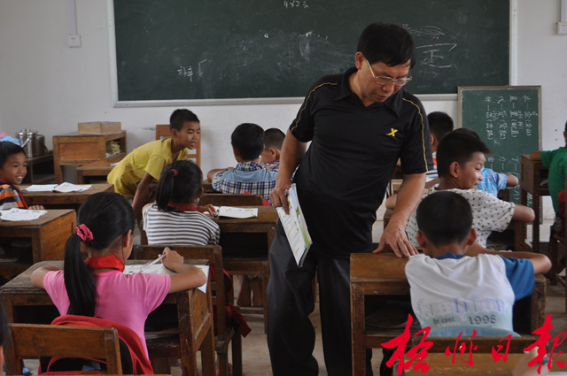 ????1992年,黃錦榮嘗試在龍洞分校開設(shè)音樂課。沒有教材,他自己謄抄,不會唱譜,他專程到旺甫鎮(zhèn)兄弟學(xué)校請教專職音樂老師。“有時候為了抄寫幾首適合學(xué)生的歌曲,要忙到半夜。”直到現(xiàn)在,除了負責(zé)龍洞分校所有教務(wù)工作、教三年級數(shù)學(xué)課程外,黃錦榮還是龍洞分校唯一的音樂老師。