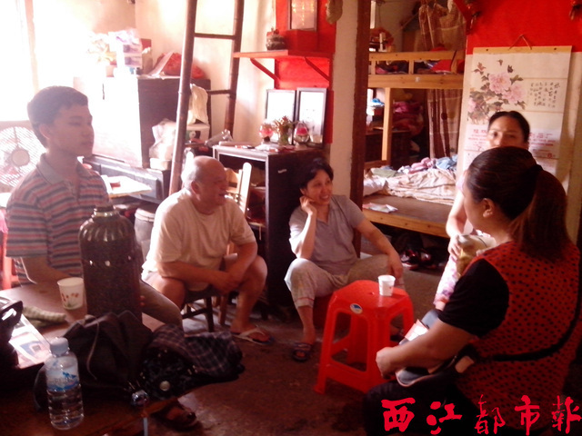 ????7月15日,愛心人士陳女士(右一)與奧奇麗社區的工作人員一起來到小晨家,了解小晨的家庭情況,并送上500元資助款。 見習記者 吳艷紅/攝