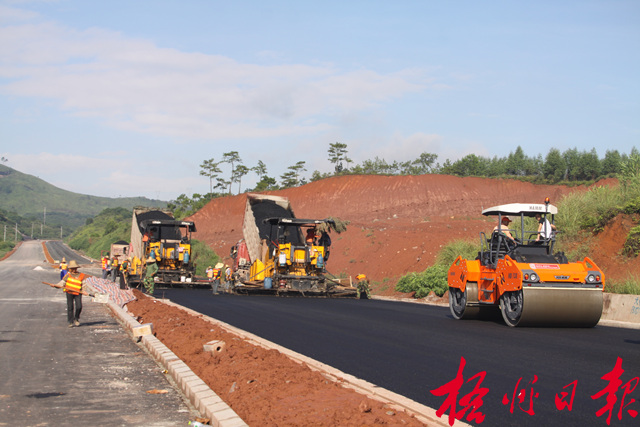 ????7月16日,在貴(港)梧(州)高速公路藤縣禮秀段,工人正鋪設瀝青路面。