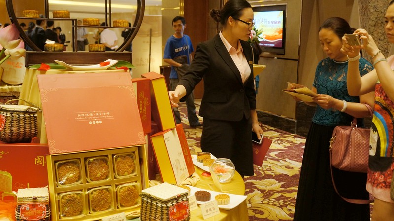 酒店工作人員向顧客介紹月餅的制作工藝與原料特點
