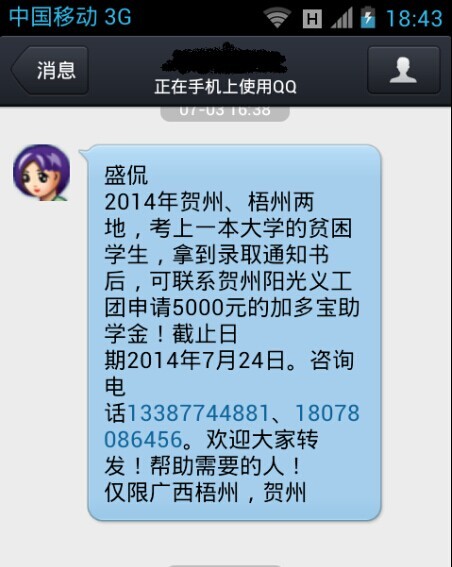 ????7月初,市民陳先生在QQ和微信上看到一則關(guān)于梧州的助學(xué)信息在QQ群、好友圈瘋狂轉(zhuǎn)發(fā),信息表示今年考上一本大學(xué)的貧困學(xué)生,可以聯(lián)系名為賀州陽(yáng)光義工團(tuán)的社會(huì)組織申請(qǐng)5000元的加多寶助學(xué)金。信息更是重點(diǎn)提示,“幫助需要的人,僅限廣西梧州、賀州。”為此,信息在梧州網(wǎng)友之間傳播范圍較廣。