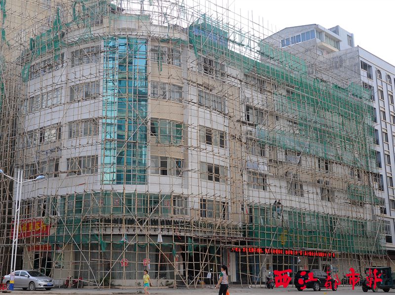 ????在樓房地層,一所銀行的營業點及一家茶店仍在正常營業。據銀行工作人員反映,時常有過往客人擔心竹木搭成的腳手架會松動散落。